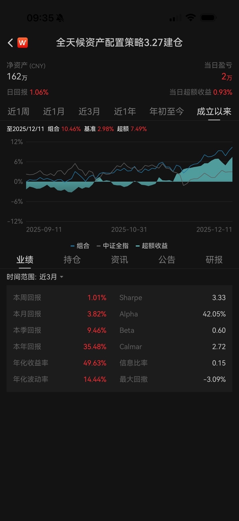 美联储降息25个基点并暗示未来购债计划(QE),有色、白银等资源品大涨,全天候策略净值再创新高(162万)。A股市场v型反转,商业航天表现强势(中国卫星),宁德时代放量上涨,创新药(益方生物等)继续轮动,中科飞测盘整后有望表现。