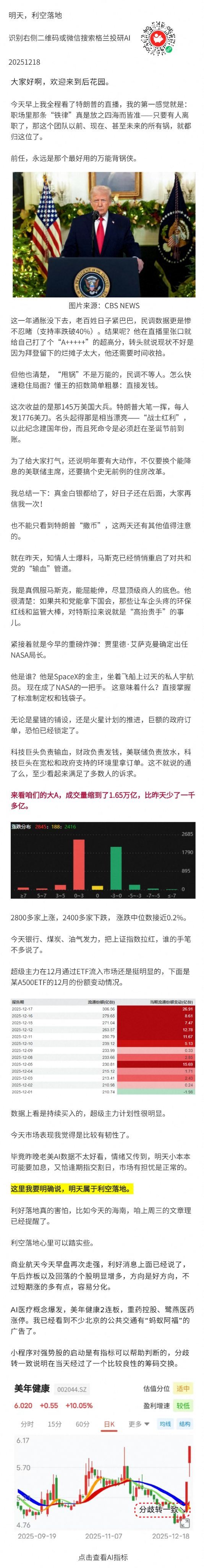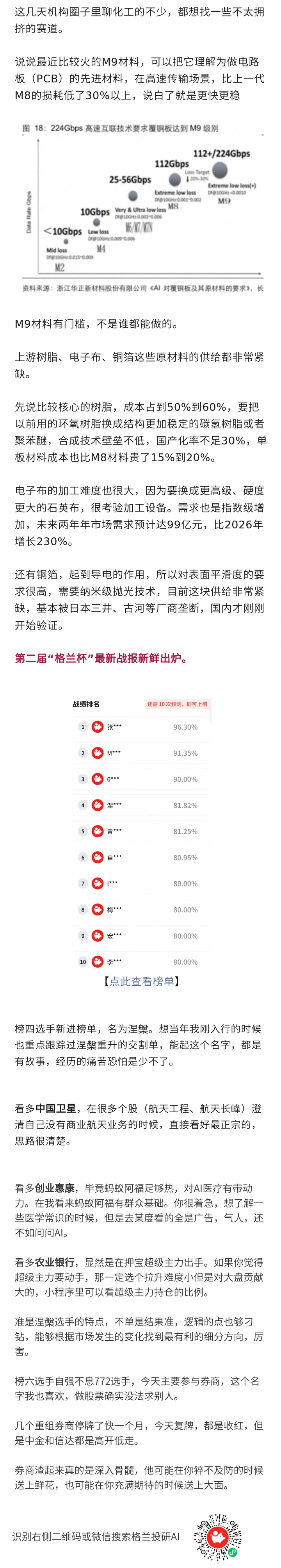 3、今天光模块要接受考验,有色和化工是明年重点,锂矿(盐湖赣锋)弹性也很大。保险依然是最核心的,今天券商复牌看看对华泰有没有帮助。商业航天龙头比较疲软,要小心兑现。腾讯昨天找了openai的人过来负责人工智能,阿里阿福很火,盘面上耐心等修复。消费重点看安井。