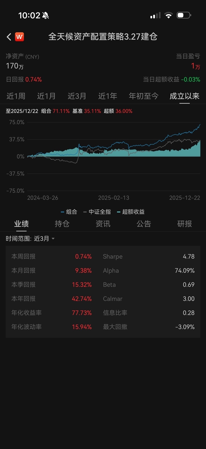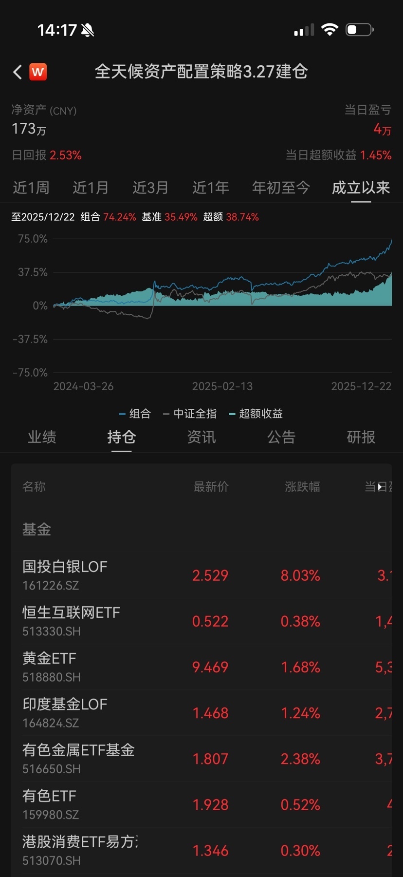 今日市场情绪显著回暖,格兰老师明确指出“最难做的时候过去了”,春季躁动已经开启前奏。随着黄金白银价格持续走高,全天候策略的表现极为稳健且再创新高。市场目前处于震荡向上的蓄势阶段,年底机会窗口已经打开。