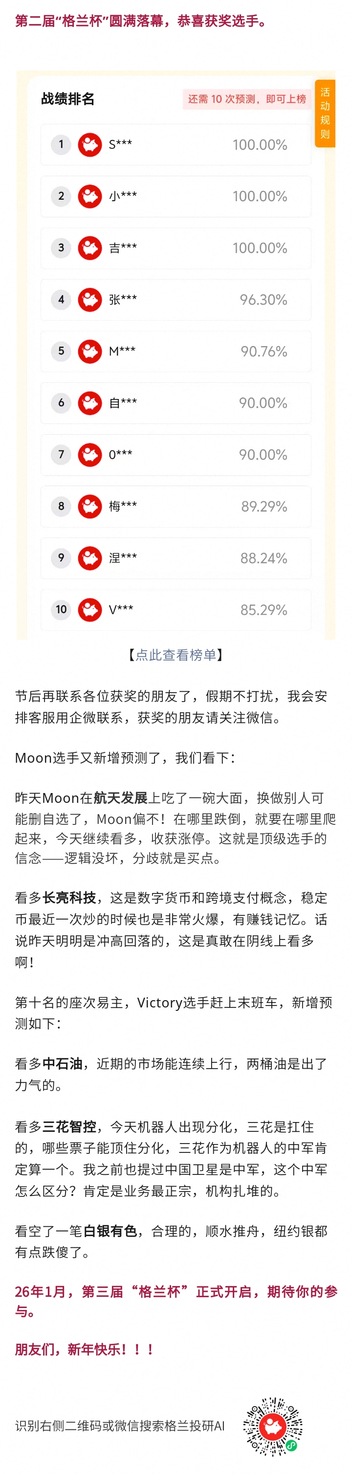 5. 有色/紫金: 紫金矿业发布2025-2026指引,金产量指引超预期,铜银略低于计划。有色板块长线逻辑坚挺。推荐 紫金矿业。