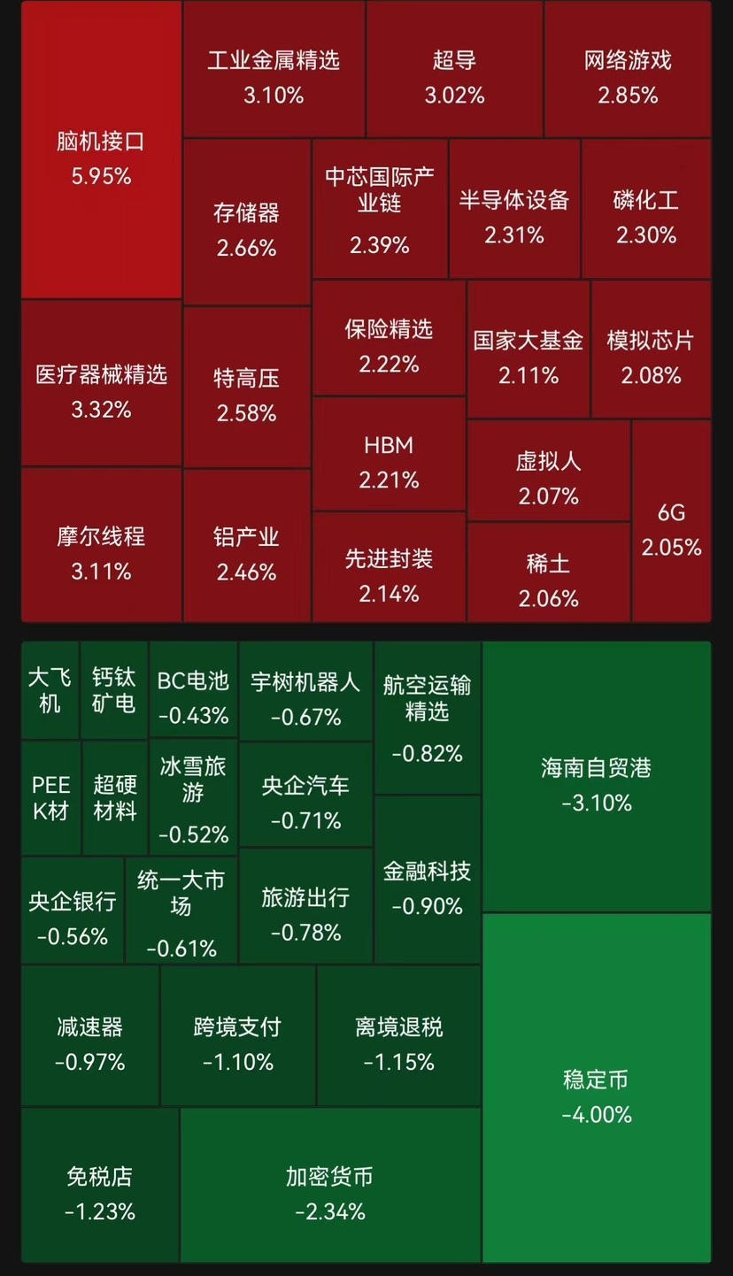今天最火的是脑机接口,这玩意会分流商业航天的资金,有相关持仓的自己下午注意一下。