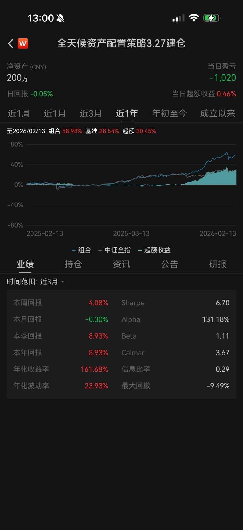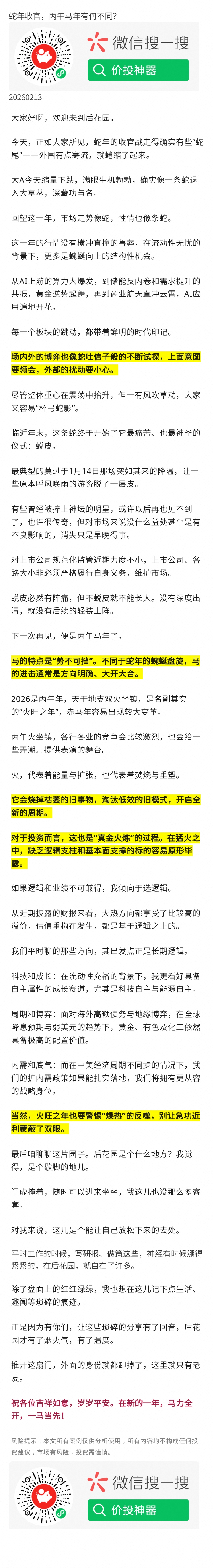 蛇年最后一个交易日,全天候新高定格在翻倍(201万)。昨天纳指暴跌、全球大宗商品暴跌,但全天候在暴跌前已清空有色化工,完美规避了外盘风险。今日北美算力全面扑街(受昨晚传导),但国产算力仍然强势,连国产半导体设备都很强——完全验证了昨天特殊早评的判断。千里科技封单38万手见证奇迹。