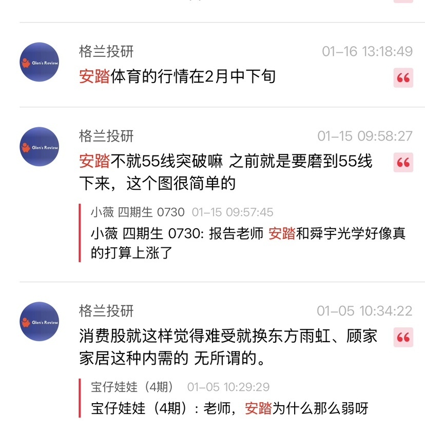 2. 消费板块(三公子+白酒): 上海放松限购利好消费预期。老师明确推荐组合——茅台/汾酒/珍酒+东方雨虹+顾家家居+安井食品,"这就够了,特别简单"。东方雨虹极强锁定,安踏马上突破继续拿(1/16号白纸黑字写的行情在2月中下旬,现已兑现)。