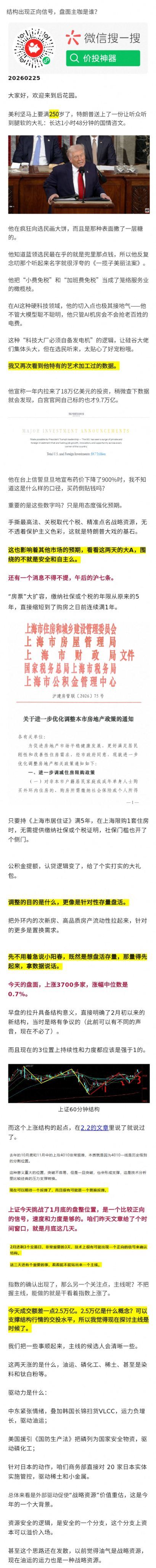 A股典型区间震荡预热行情,结构分化明显。资源股(有色、石油、油运、油服)最给力,周期股表现突出(太阳纸业新高、中国铝业走强)。消费三公子(东方雨虹、顾家家居、安井食品)受地产放松政策催化表现活跃。国产算力/半导体设备在老师看来属于误杀,富创精密等上游设备供应商弹性足。特朗普国情咨文讲话带来盘中波动,港股跟美股反弹。中芯国际有好消息释放,老师此前预判的"惊喜"兑现。