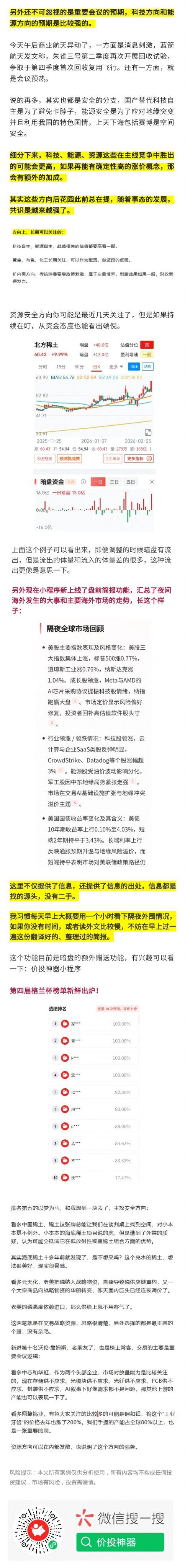 1. 资源周期股: 有色、石油、油运、油服最给力,周策略精准点名紫金矿业和中国铝业。太阳纸业已经新高,老师感慨"周期股其实挺好做的"。中金有色研报全面看多电解铝——供给弹性下降、需求受益双宽松、铝价有望再创新高,沪铝回调8.4%后估值不到9倍具备布局性价比。